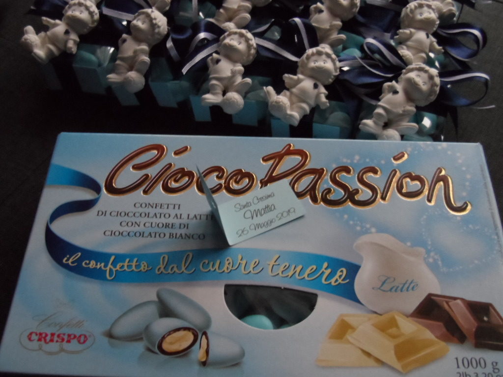 Bimbo calcio in gessetto. Pwe questa bomboniera hanno scelto confetti al cioccolato azzurri, morbidi e gustosi, e bigliettino azzurro cordinati ai confetti Crispo
