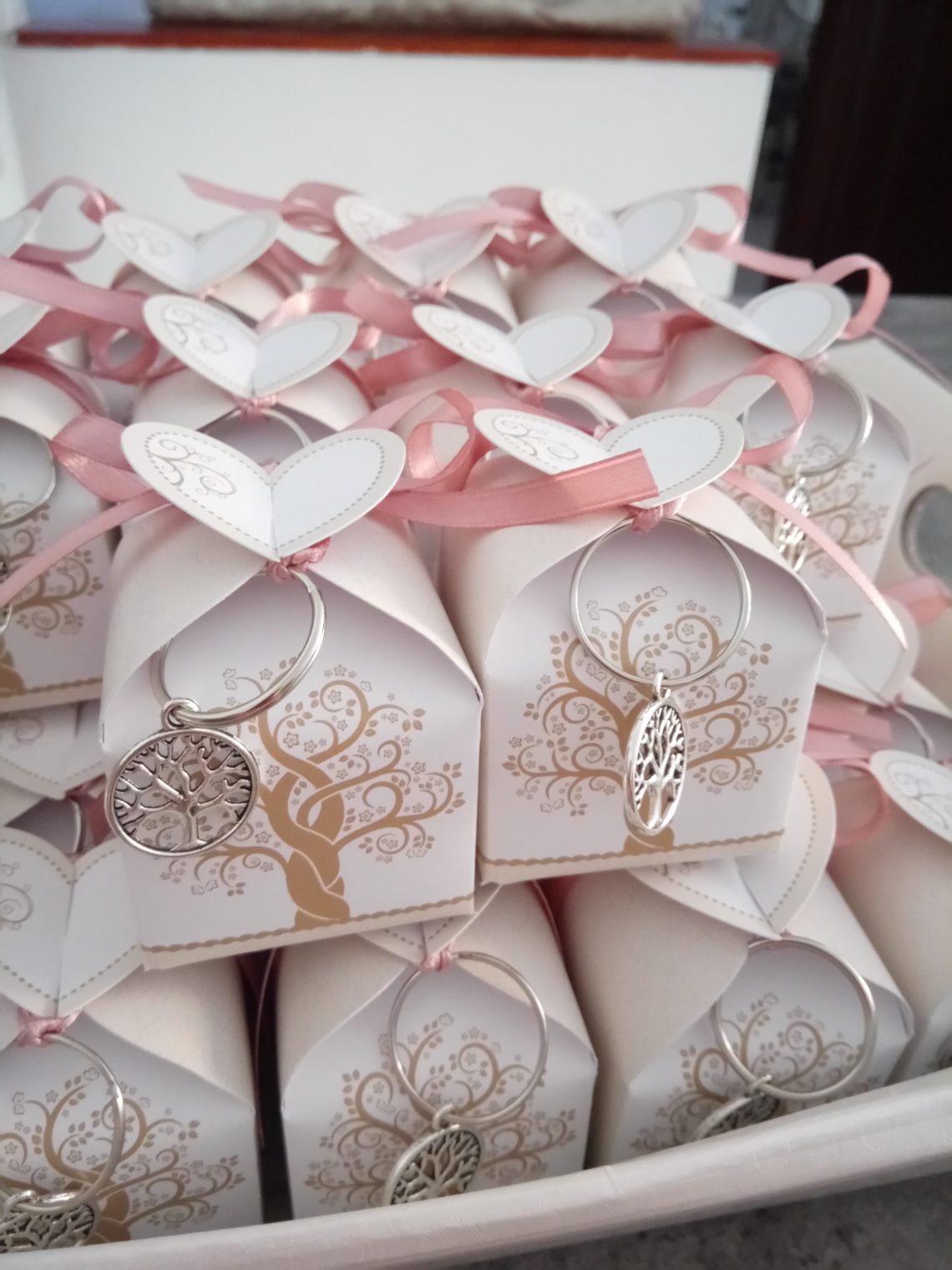 Scatolina porta confetti albero della vita, con bigliettino a tema, e portachiavi in metallo abbinato