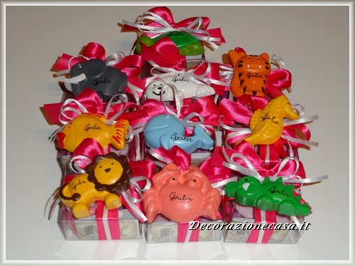 La scatolina in pvc, h27x50x53mm è confezionata con 7 confetti al cioccolato rosa sfumati,bigliettino,calamite in gesso fatte a mano e personalizzate con nome. Nastro in doppio raso color fuxia brillante 1,5cm e nastrino in doppio raso bianco da 3mm.
