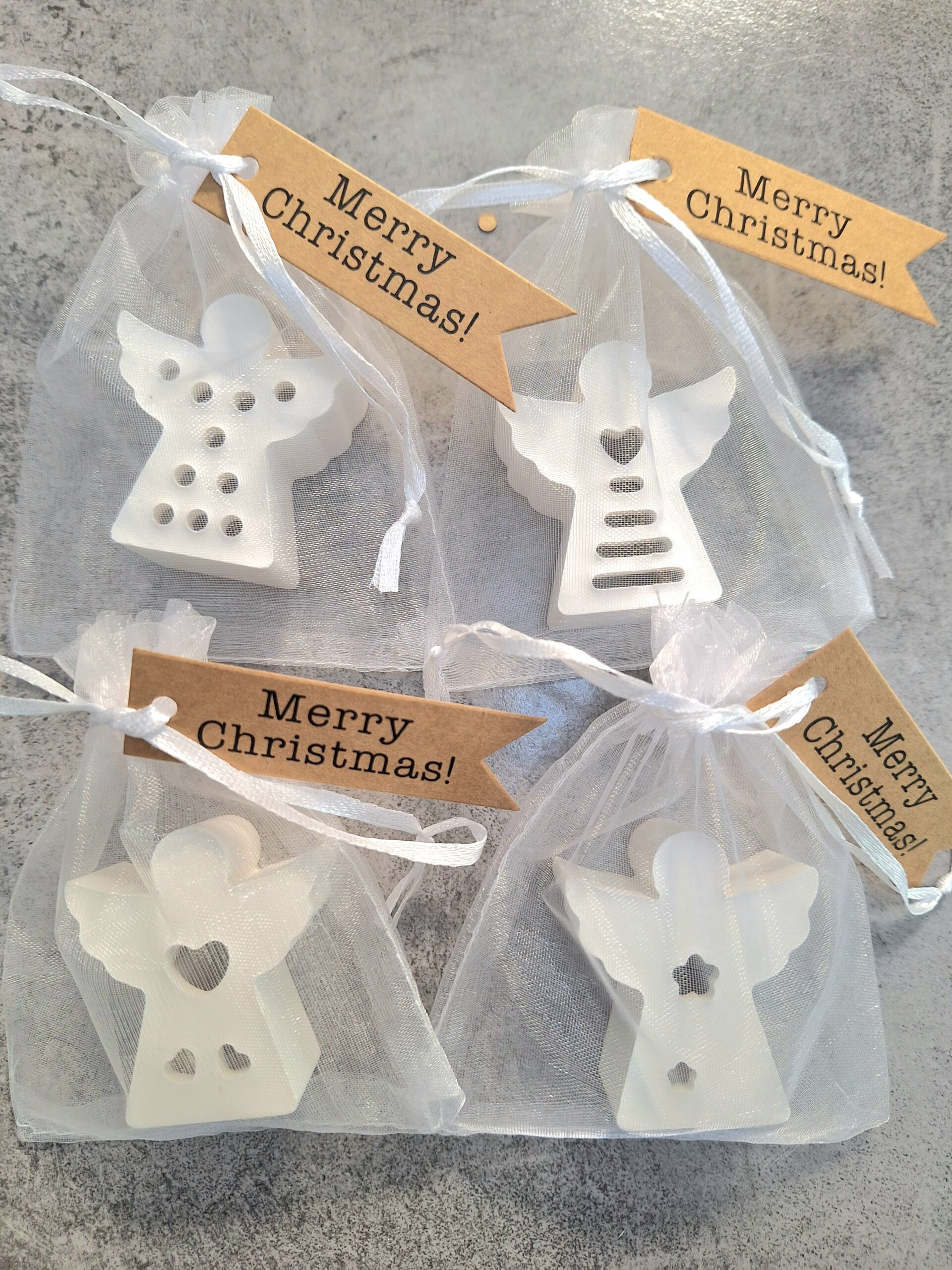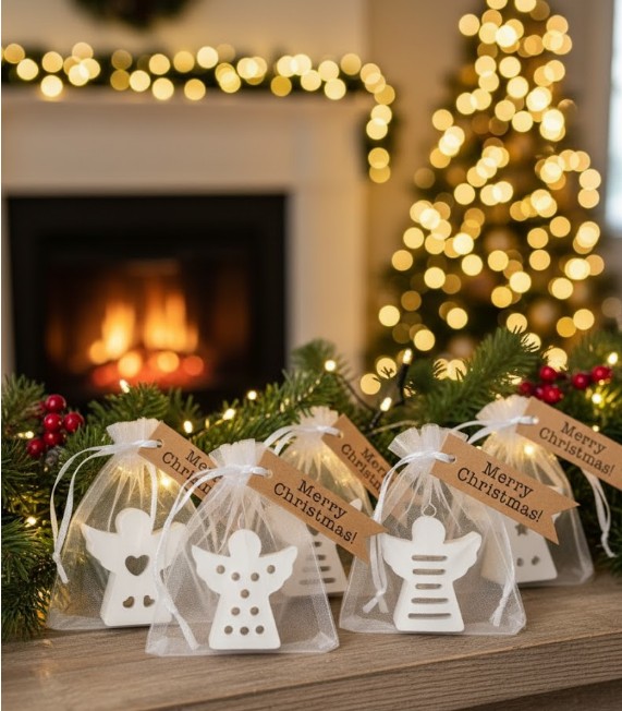 Angioletti natalizi segnaposto in sacchetto di organza e bigliettino.