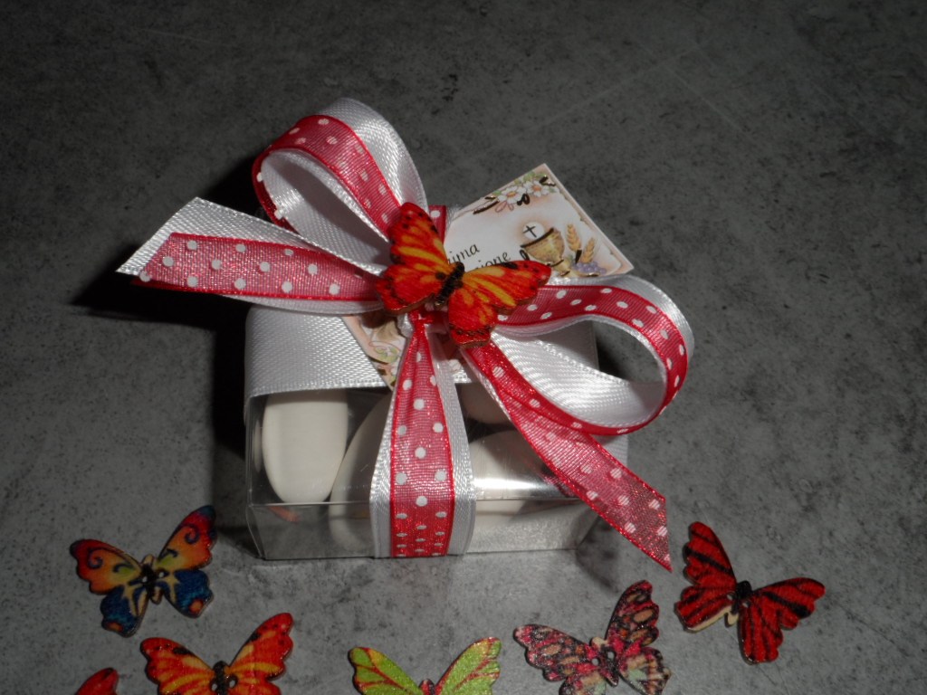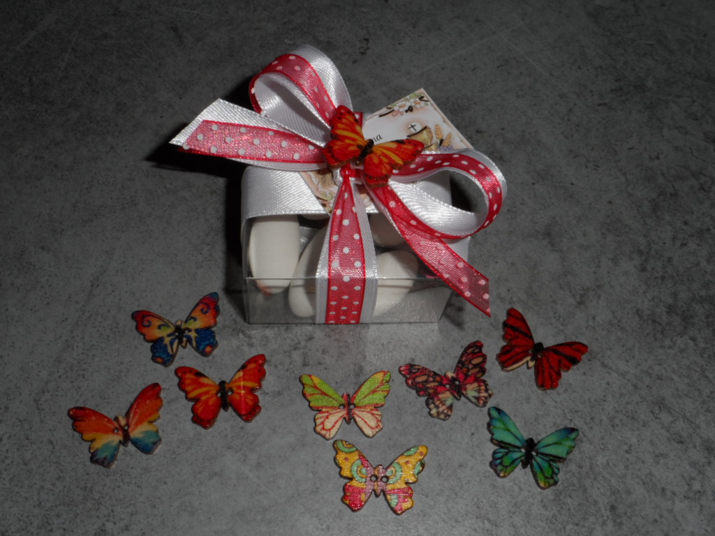 Scatolina in pvc h27x50x53mm, nastro in doppio raso bianco da 1,5 cm, nastro organza rosso a pois da 10 mm, 5 confetti bianchi al cioccolato, Bottone a forma di farfalla in legno da 2 cm, colori misti ,