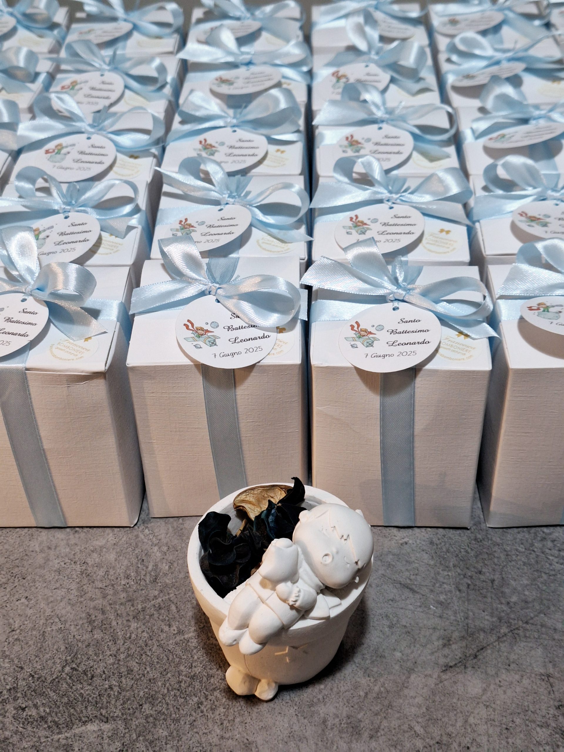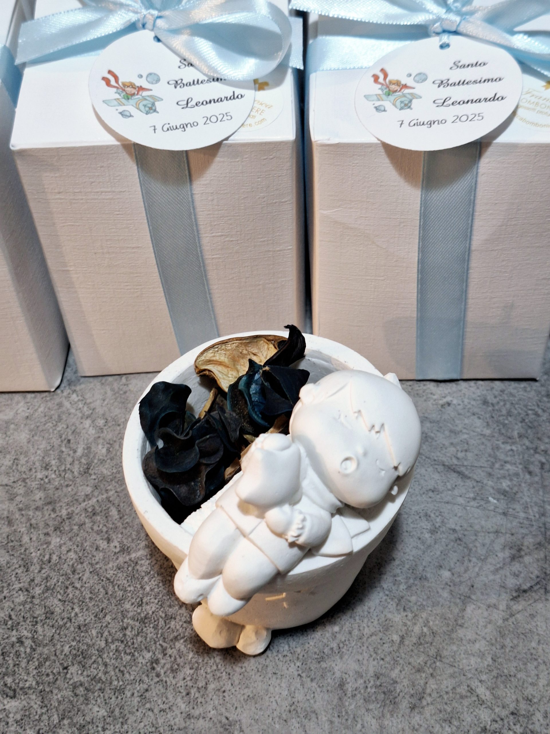 Vasetto piccolo principe in gesso Diplast con poutporri messo all’interno della scatolina in cartoncino bianco h 12x9x9 cm, 5 confetti al cioccolato o mandorla chiusi in bustina di plastica trasparente, nastro in doppio raso e tag
