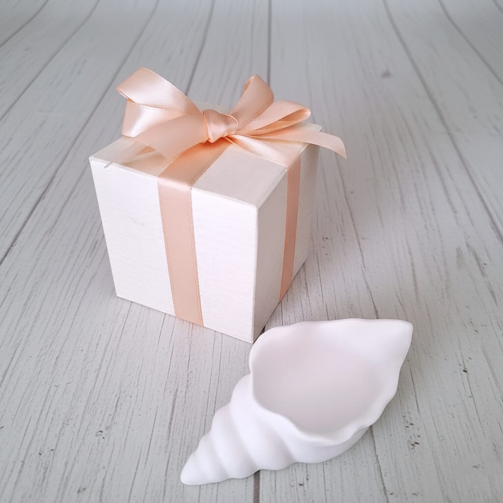 Scatola in cartoncino Bianco o Avorio 8x8x8 cm, conchiglia in gesso L 12.5 x 5,5 cm, 5 confetti bianchi al cioccolato o mandorla chiusi in bustina di plastica trasparente, nastro in doppio Raso, colore a scelta.