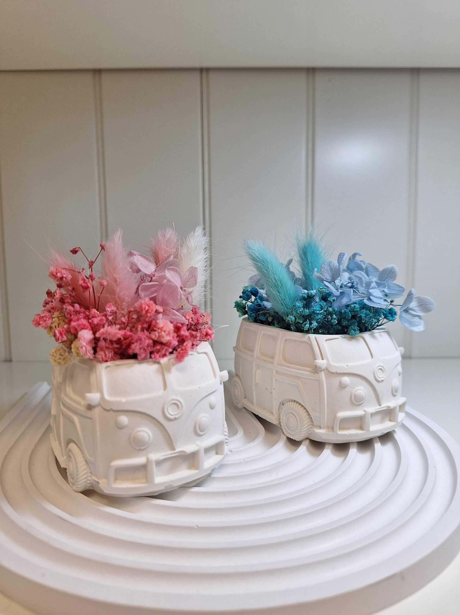 Furgoncino bomboniera floreale con Ortensia stabilizzata e fiori essicati.