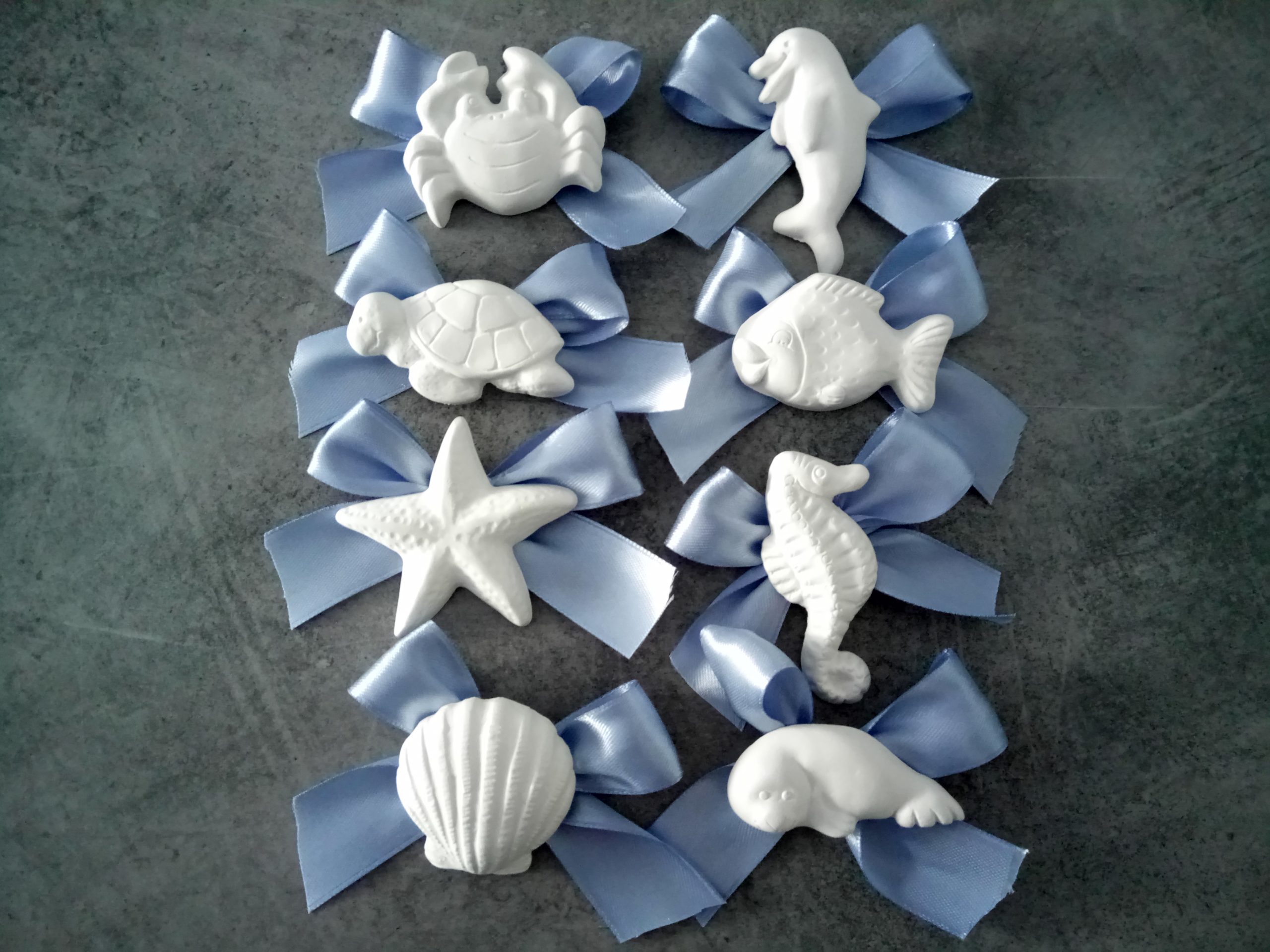 La foto rappresentativa, mostra conchiglie in gesso profumato con nastro in doppio raso color Avion, largo cm 2,5