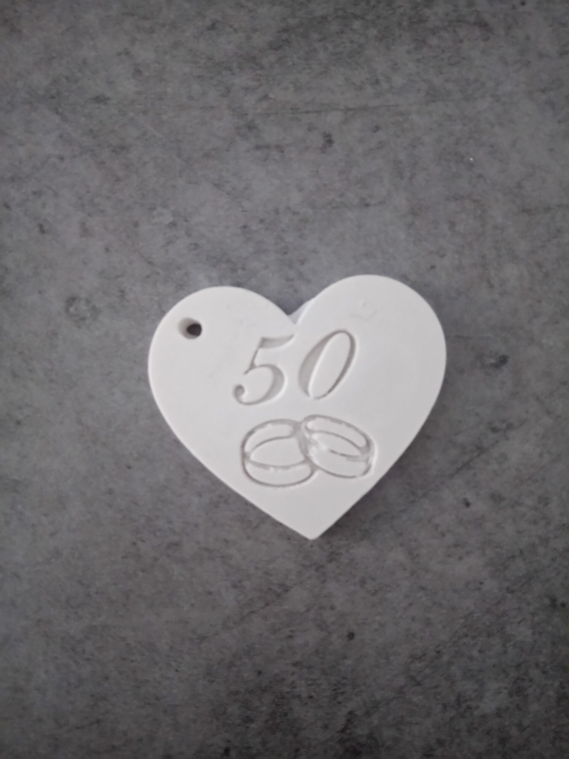 Gessetto 50 esimo matrimonio per festeggiare i vostri 50 anni insieme. Gessetto a forma di cuore con numero 50 e fedi nuziali.