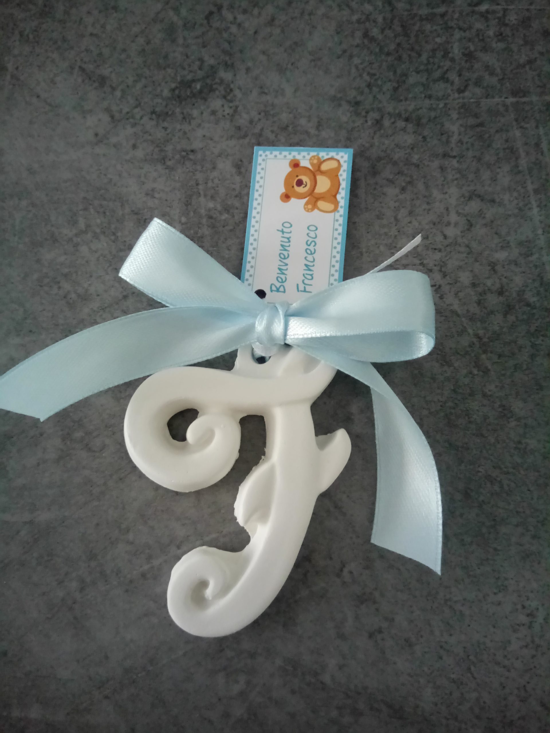 Lettera F in gesso profumato con nastro e tag