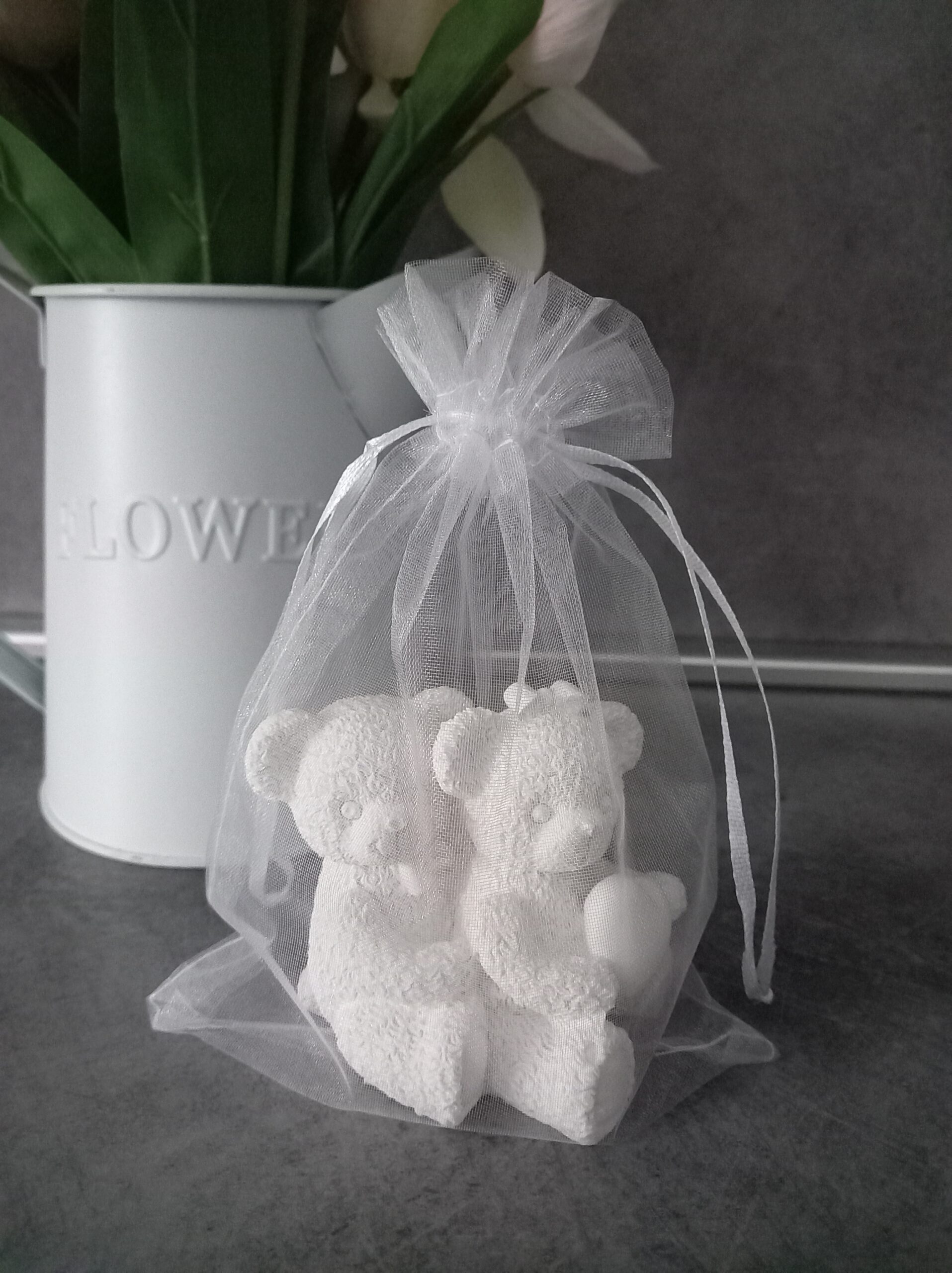 Orsetti cuore profumati in gesso in bustina di organza