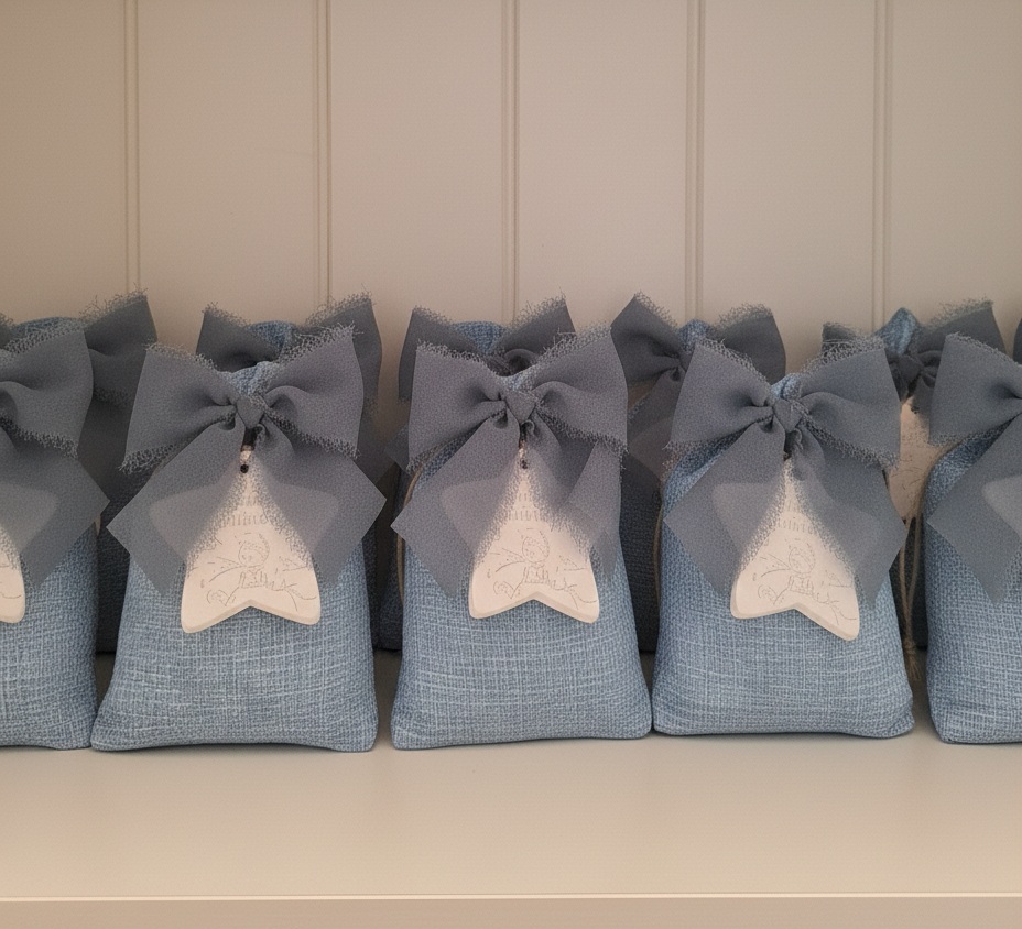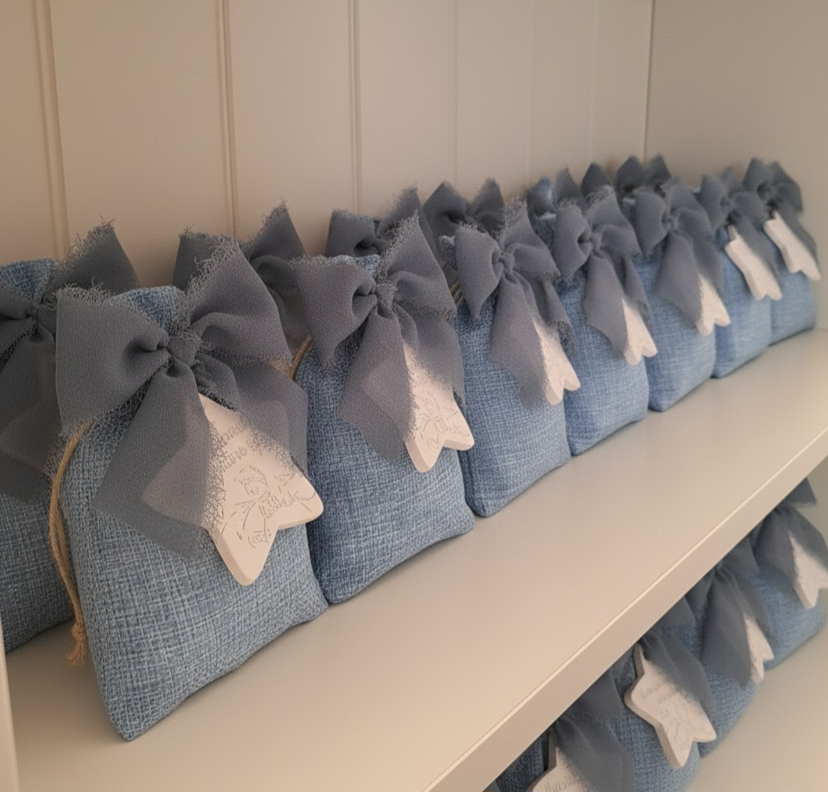Questo raffinato sacchetto bomboniera in tessuto celeste custodisce una stellina in gesso profumato, incisa con le intramontabili frasi de Il Piccolo Principe.