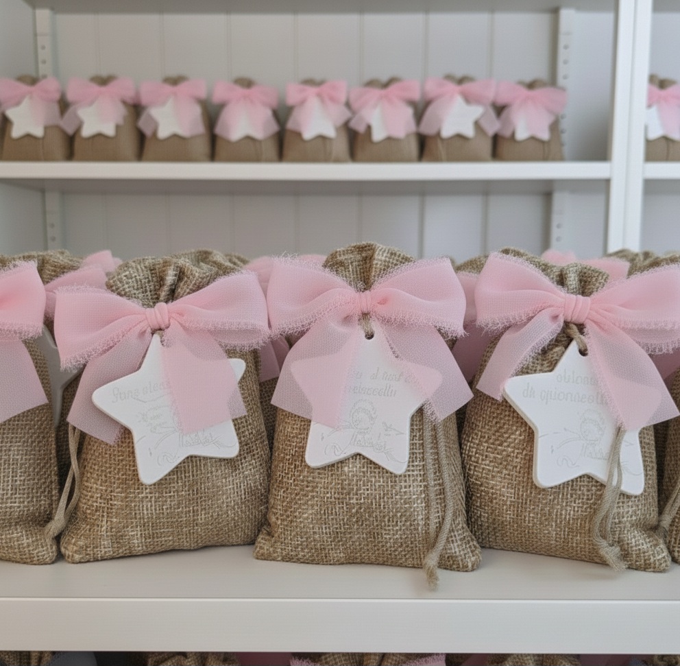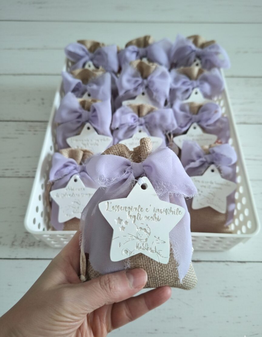 Ogni sacchetto custodisce una stellina in gesso profumato, un omaggio artigianale e duraturo.
