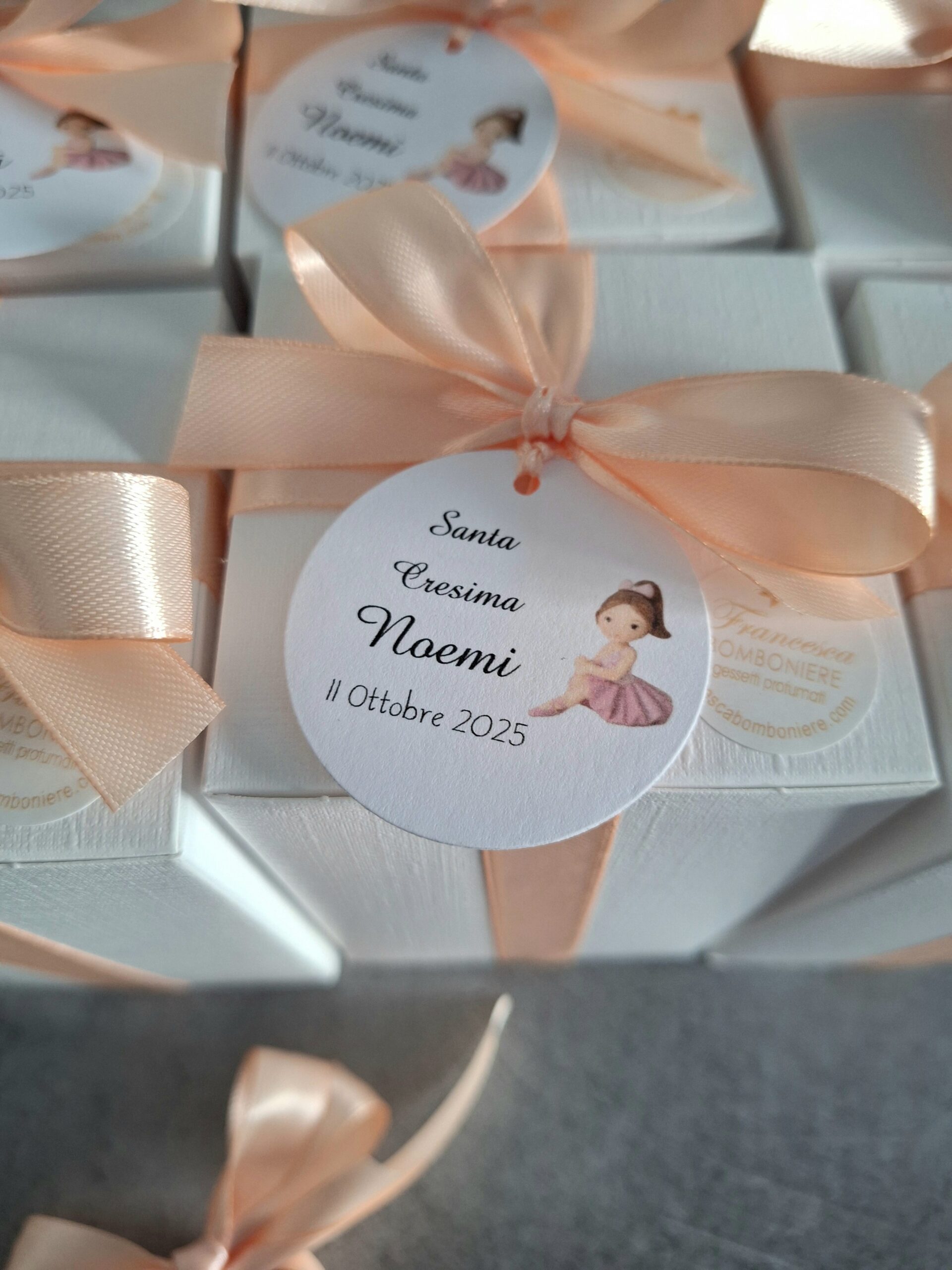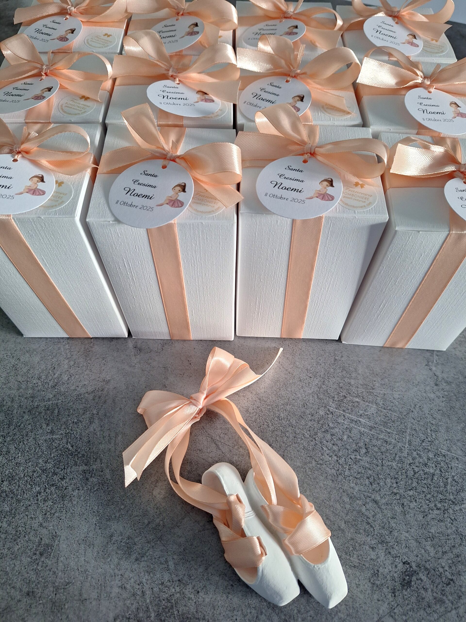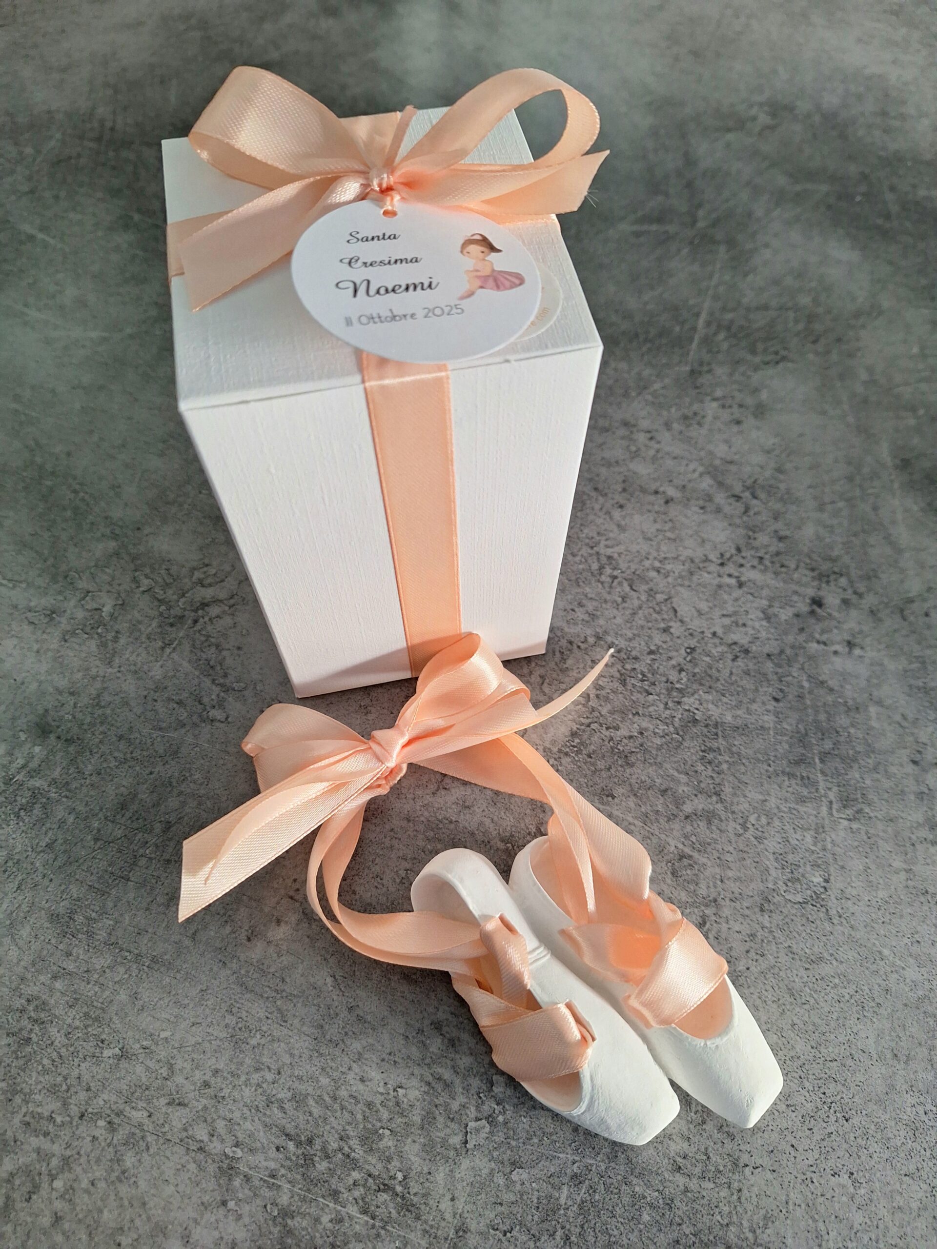 Scarpette danza in gesso profumato con nastro in doppio raso, messe in scatolina di cartoncino Bianco ( protette da carta velina e pluribool)