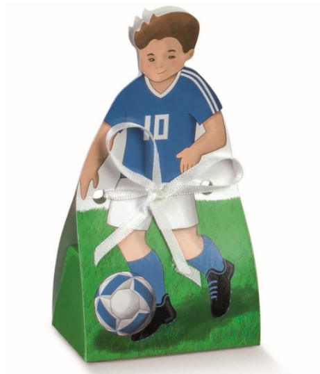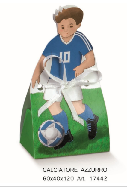 Scatola porta confetti Calciatore con maglia Celeste misura 60x40x120 mm, ideale per Comunione, Cresima e compleanno.