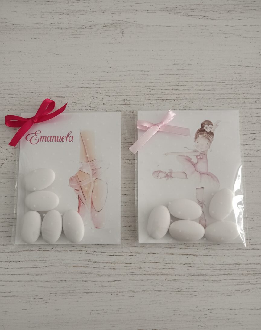 Confezionato in bustina trasparente con stelline, 5 confetti bianchi al cioccolato. Fiocchetto in doppio raso.