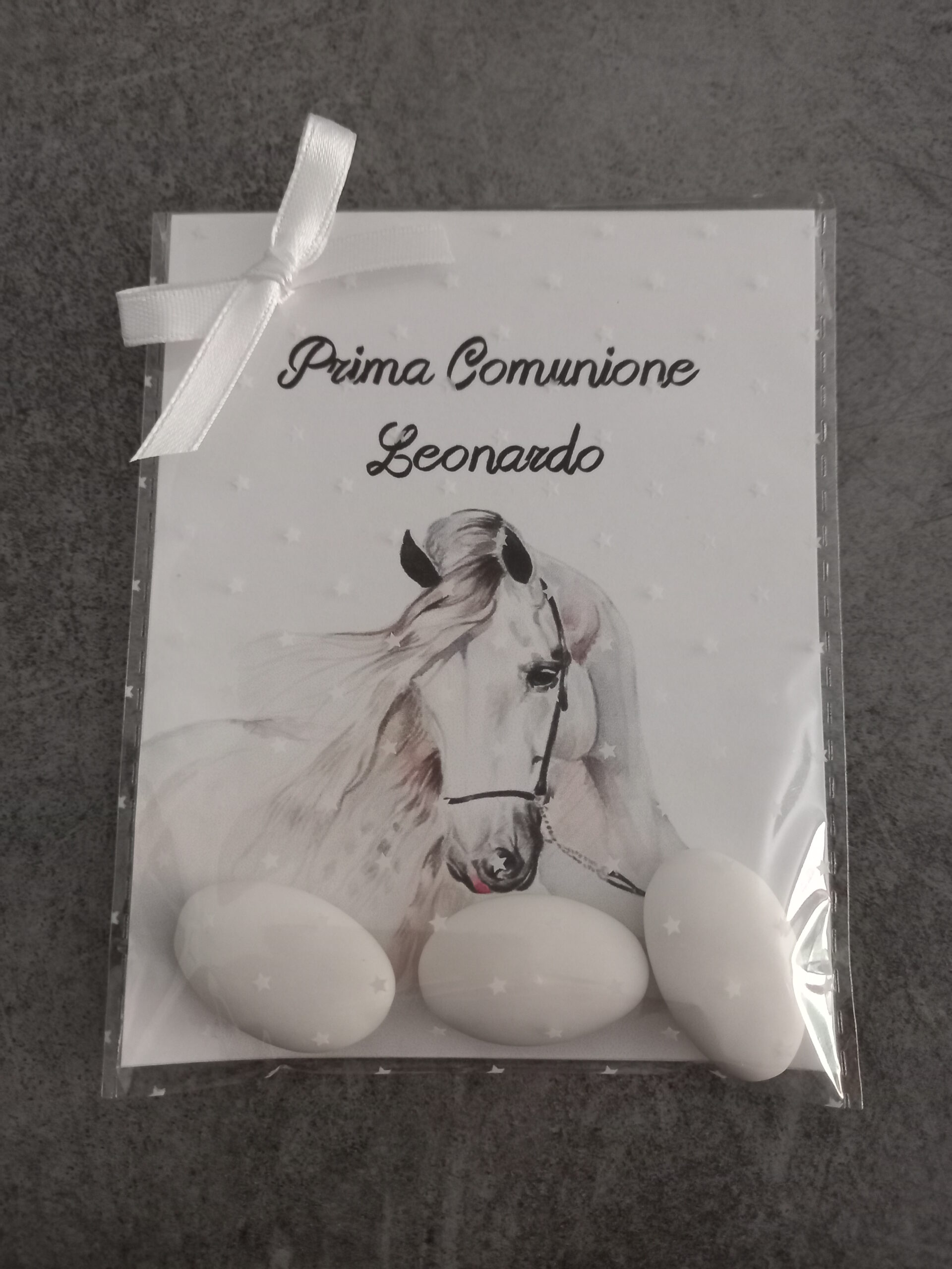 Confezionato in bustina trasparente con stelline, 3 confetti bianchi al cioccolato. Fiocchetto in doppio raso.