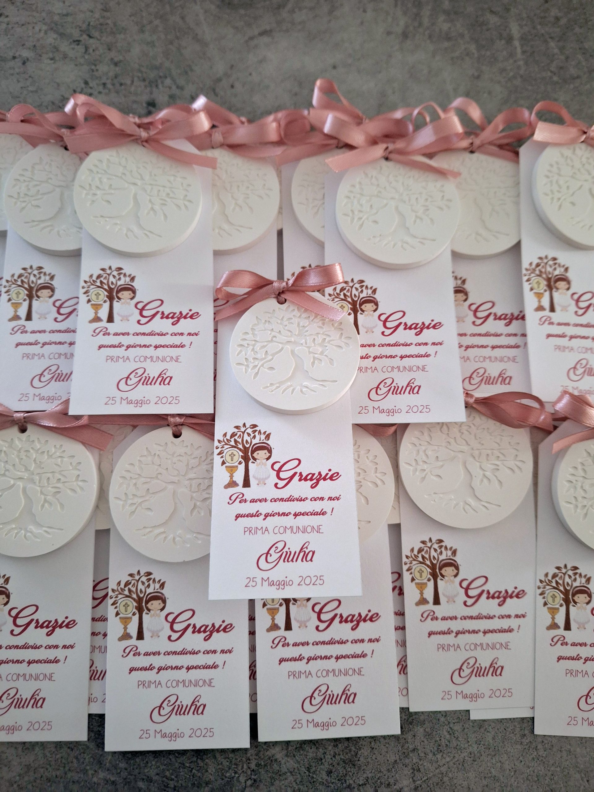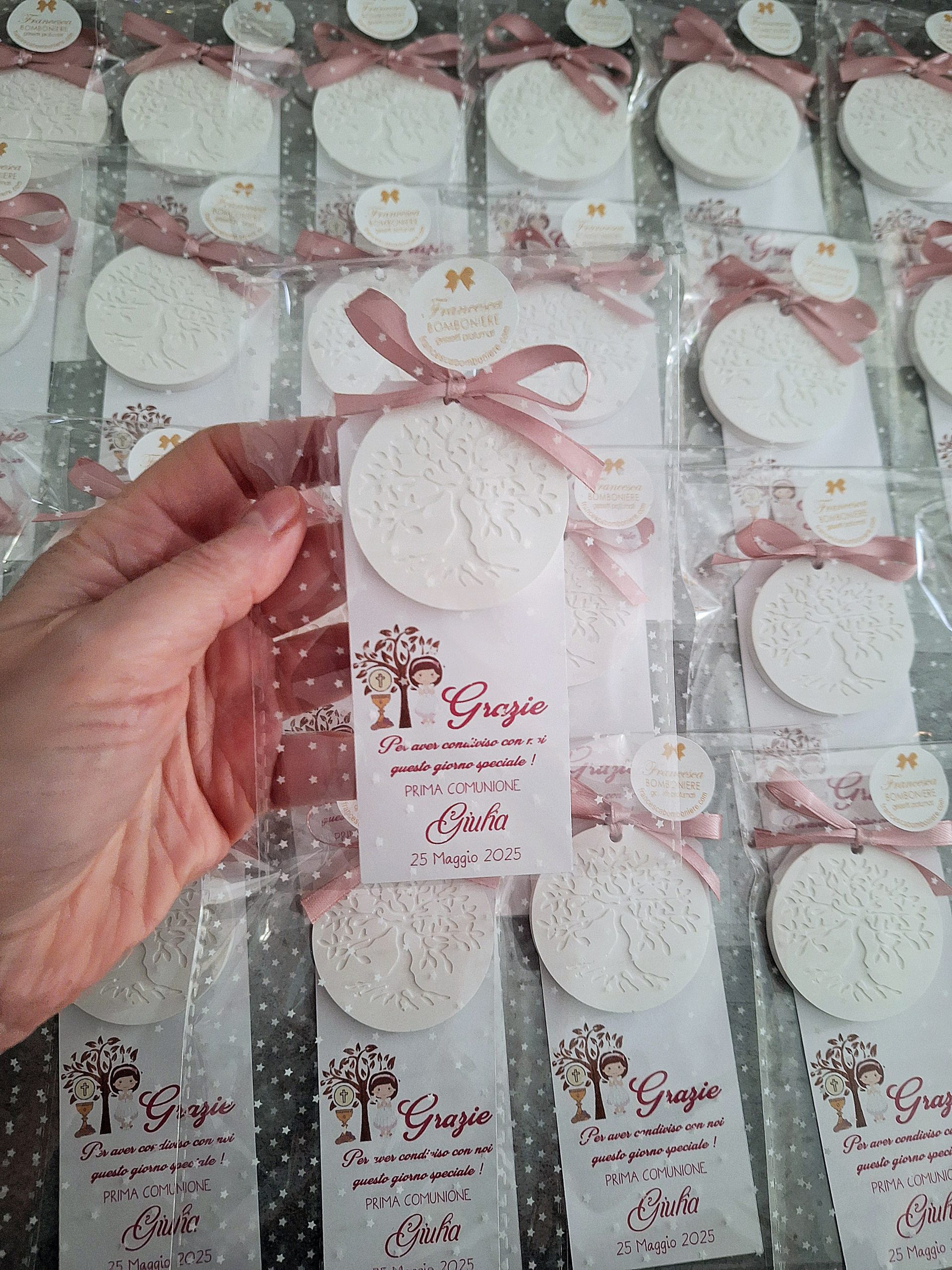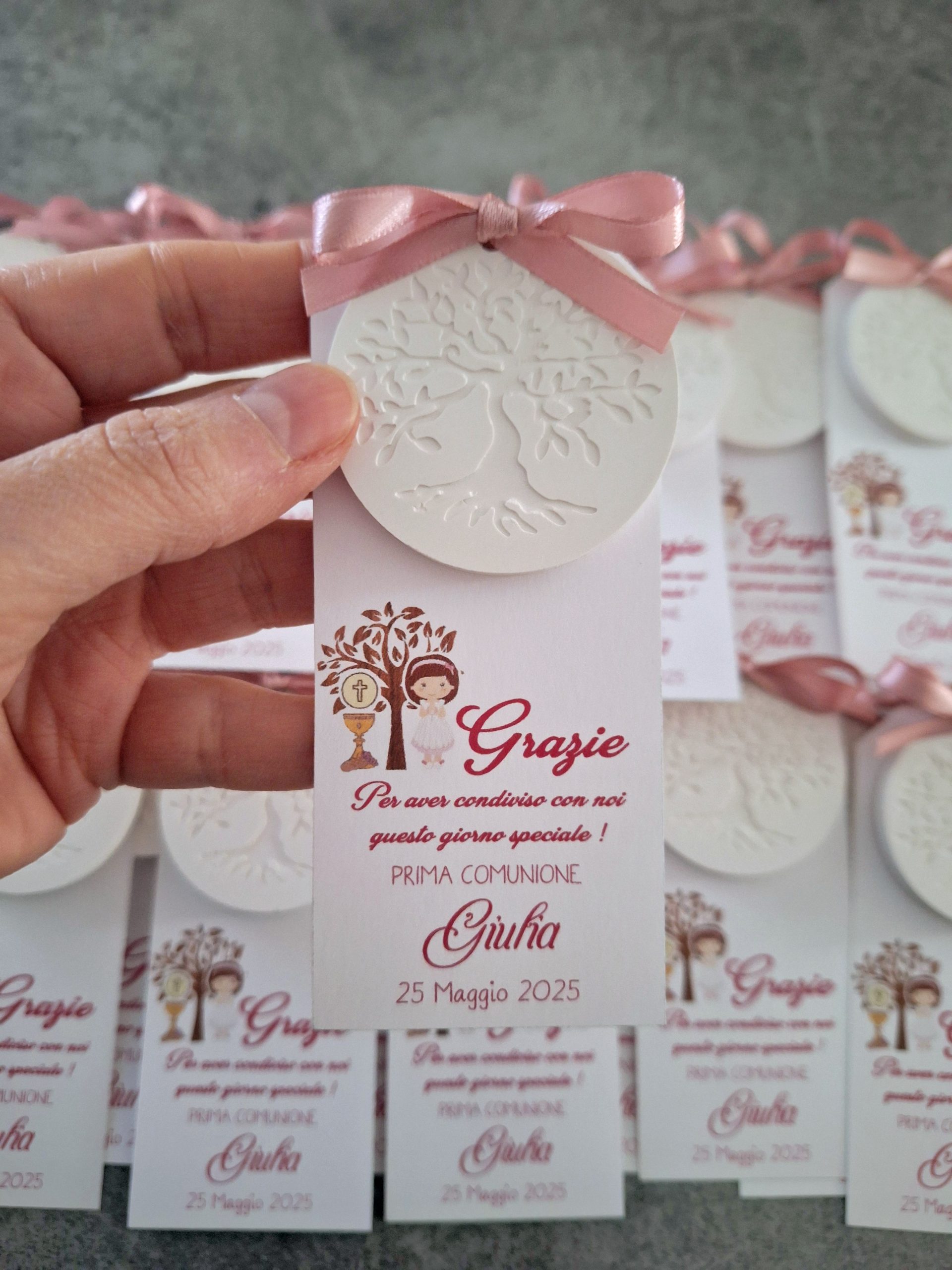 Segnaposto comunione con gessetto albero della vita e nastro in doppio raso Rosa Antico