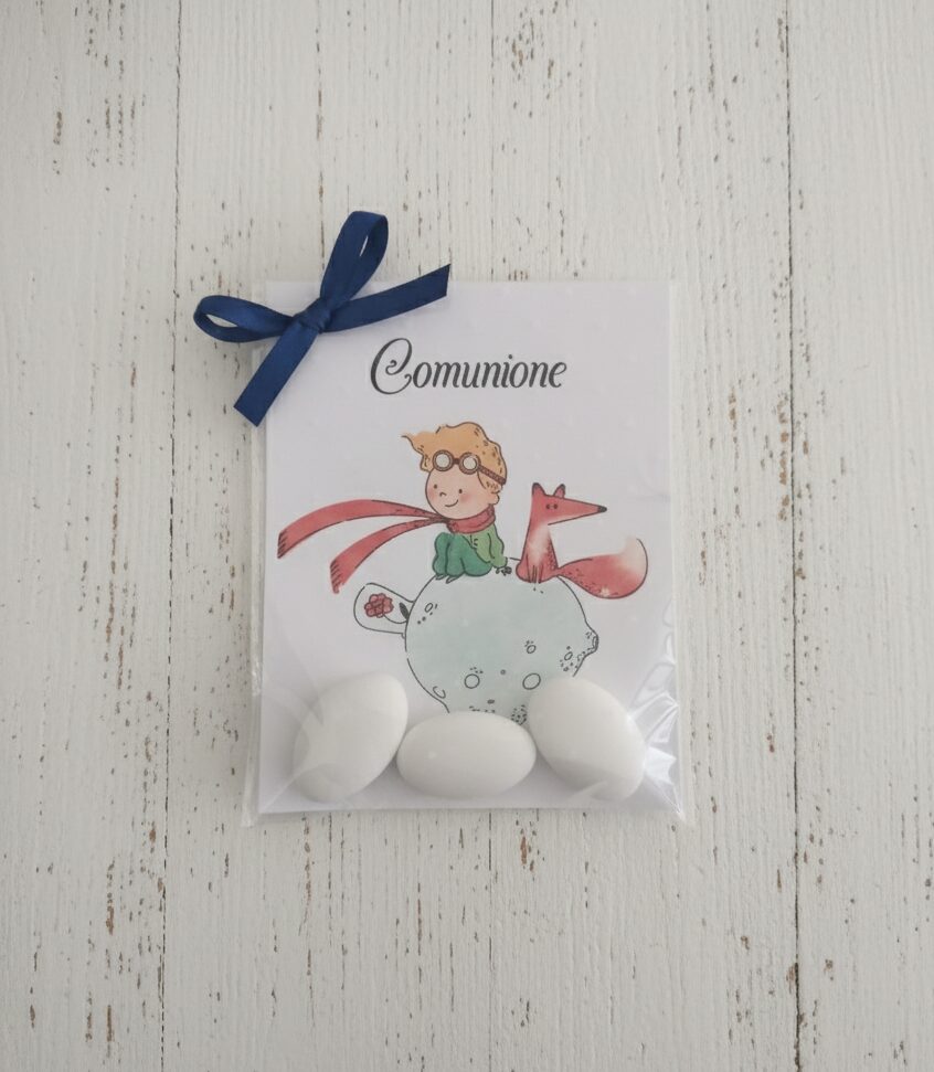 Confezionato in bustina trasparente con stelline, 3 confetti bianchi al cioccolato. Fiocchetto in doppio raso.
