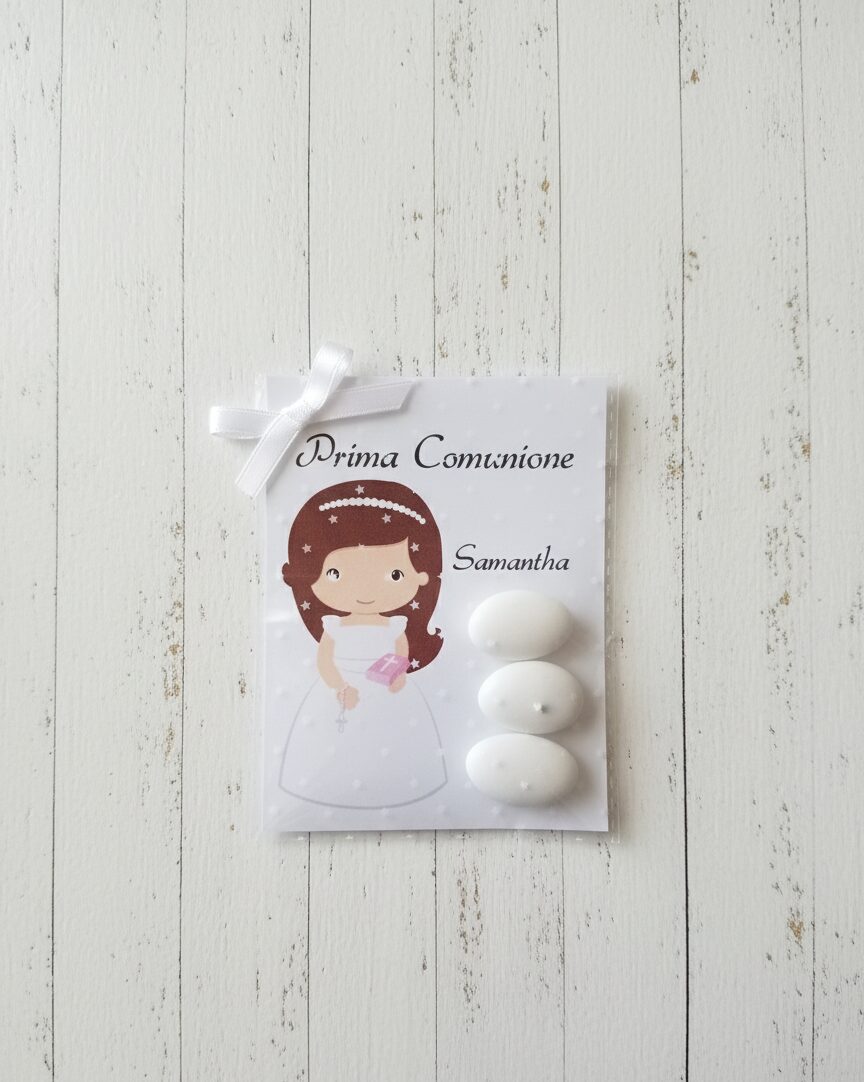 Confezionato in bustina trasparente con stelline, 3 confetti bianchi al cioccolato. Fiocchetto in doppio raso.