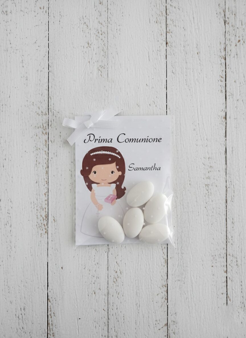 Confezionato in bustina trasparente con stelline, 5 confetti bianchi al cioccolato. Fiocchetto in doppio raso.