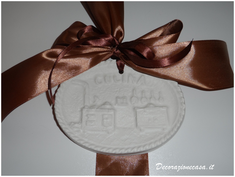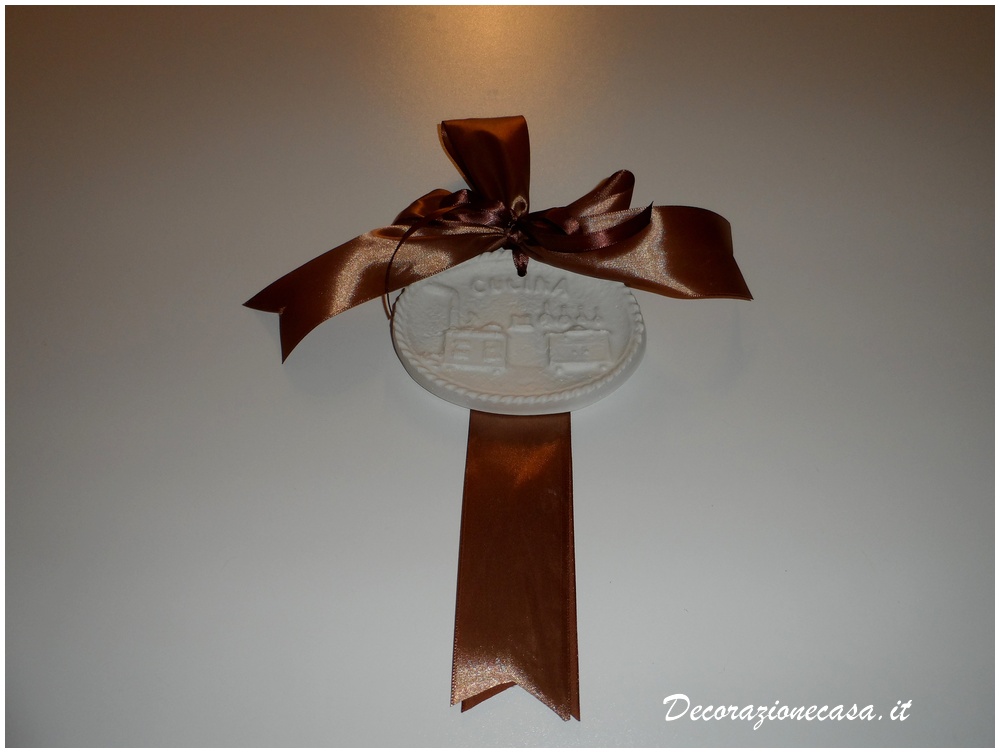 Targhetta cucina in gesso con nastro di raso marrone, realizzata a mano.