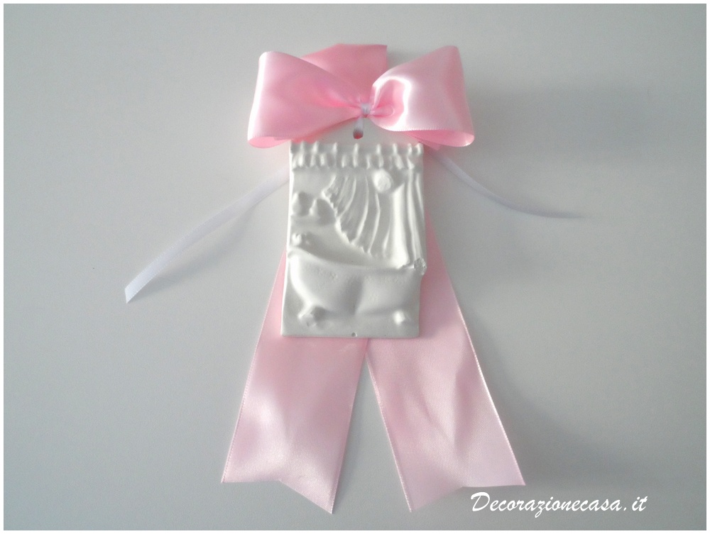 Targhetta bagno in gesso con nastro in raso Rosa da appendere.