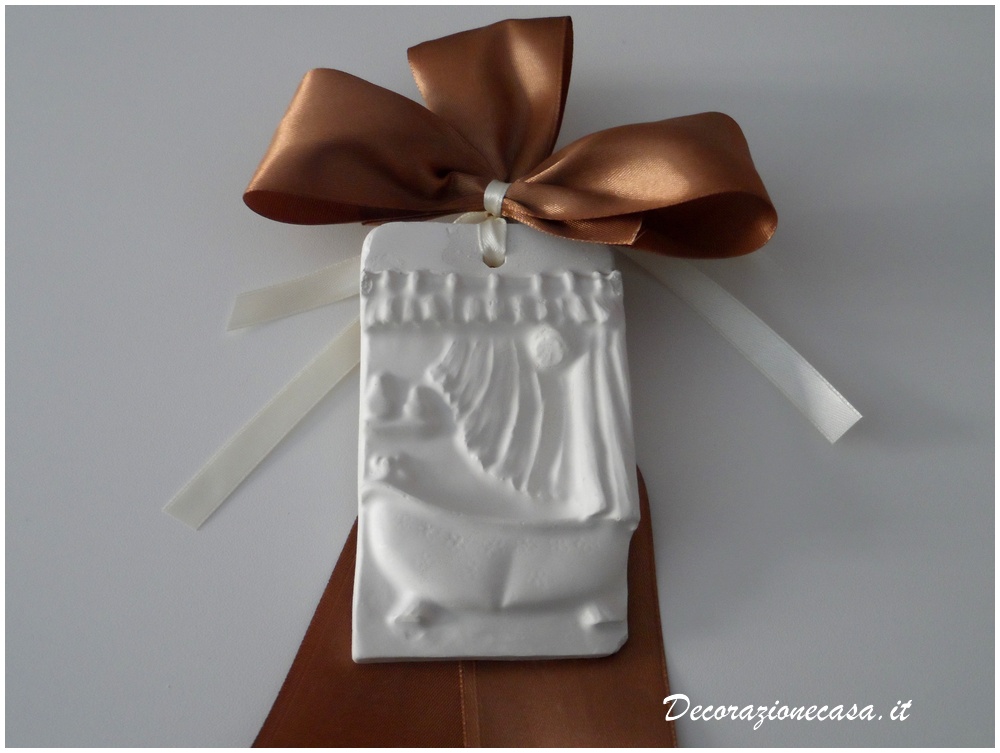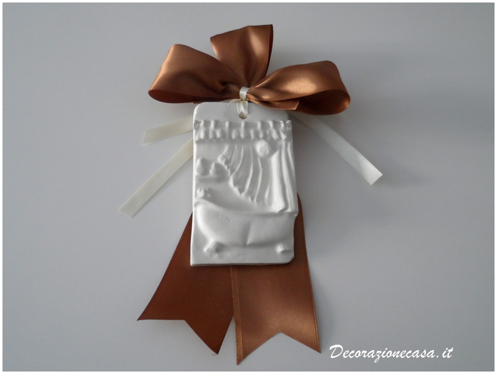Targhetta bagno in gesso con nastro in raso marrone da appendere.
