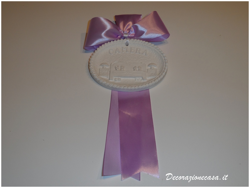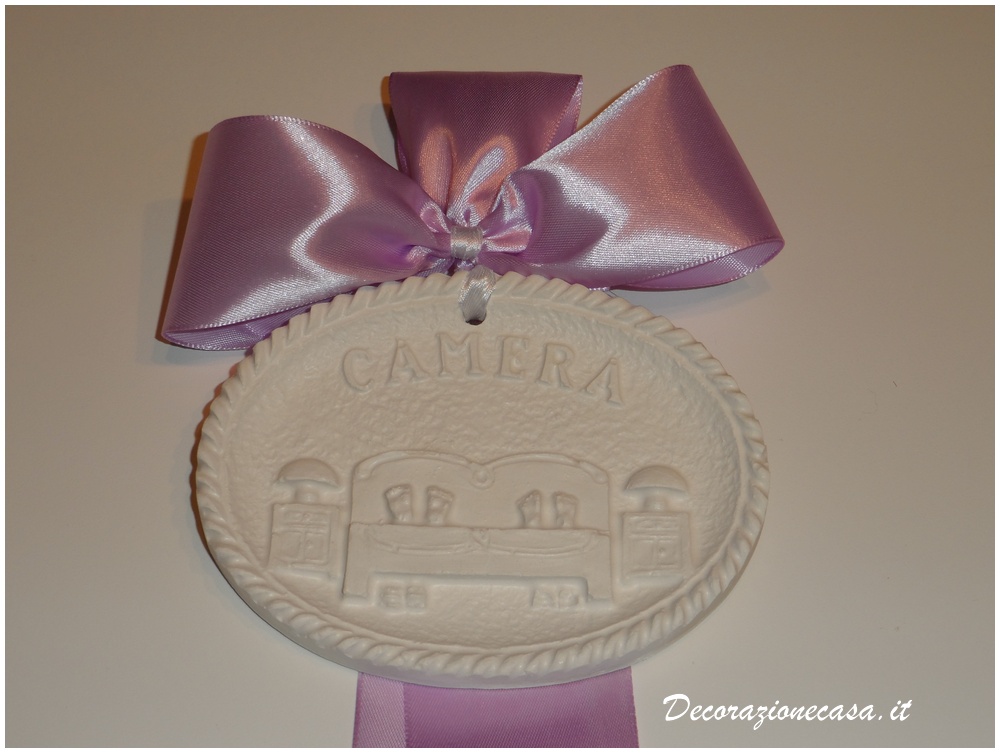 Targhetta camera lilla in gesso da appendere con nastro di raso  realizzata a mano.